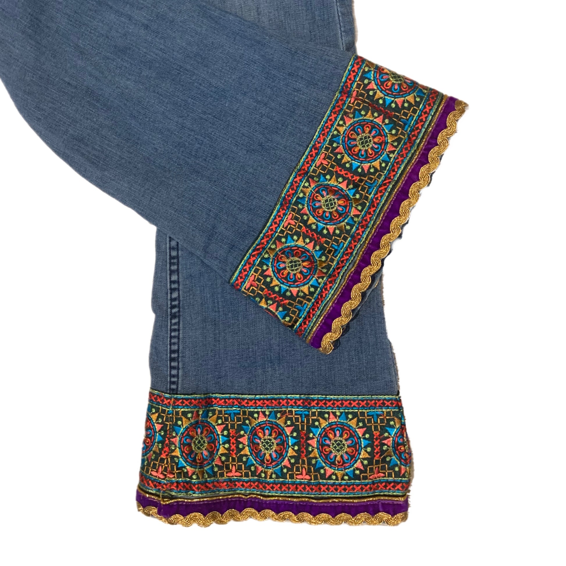 Vintage high-rise jeans with a unique geometric trim and purple and gold velvet hemming.