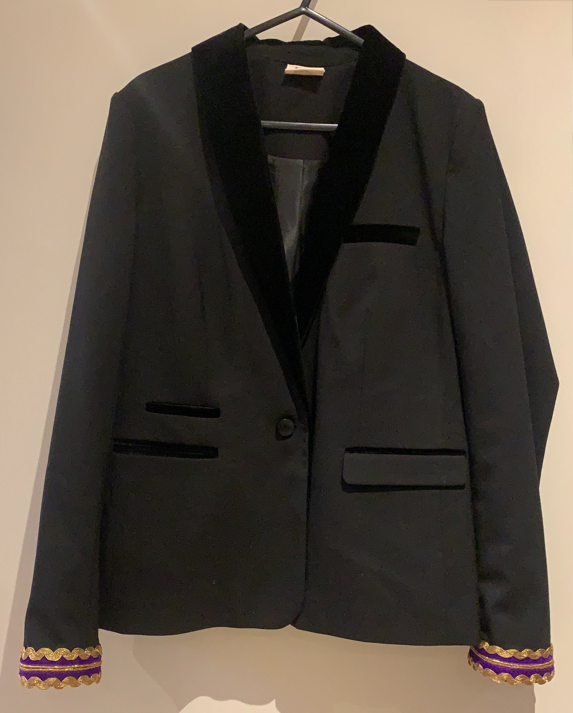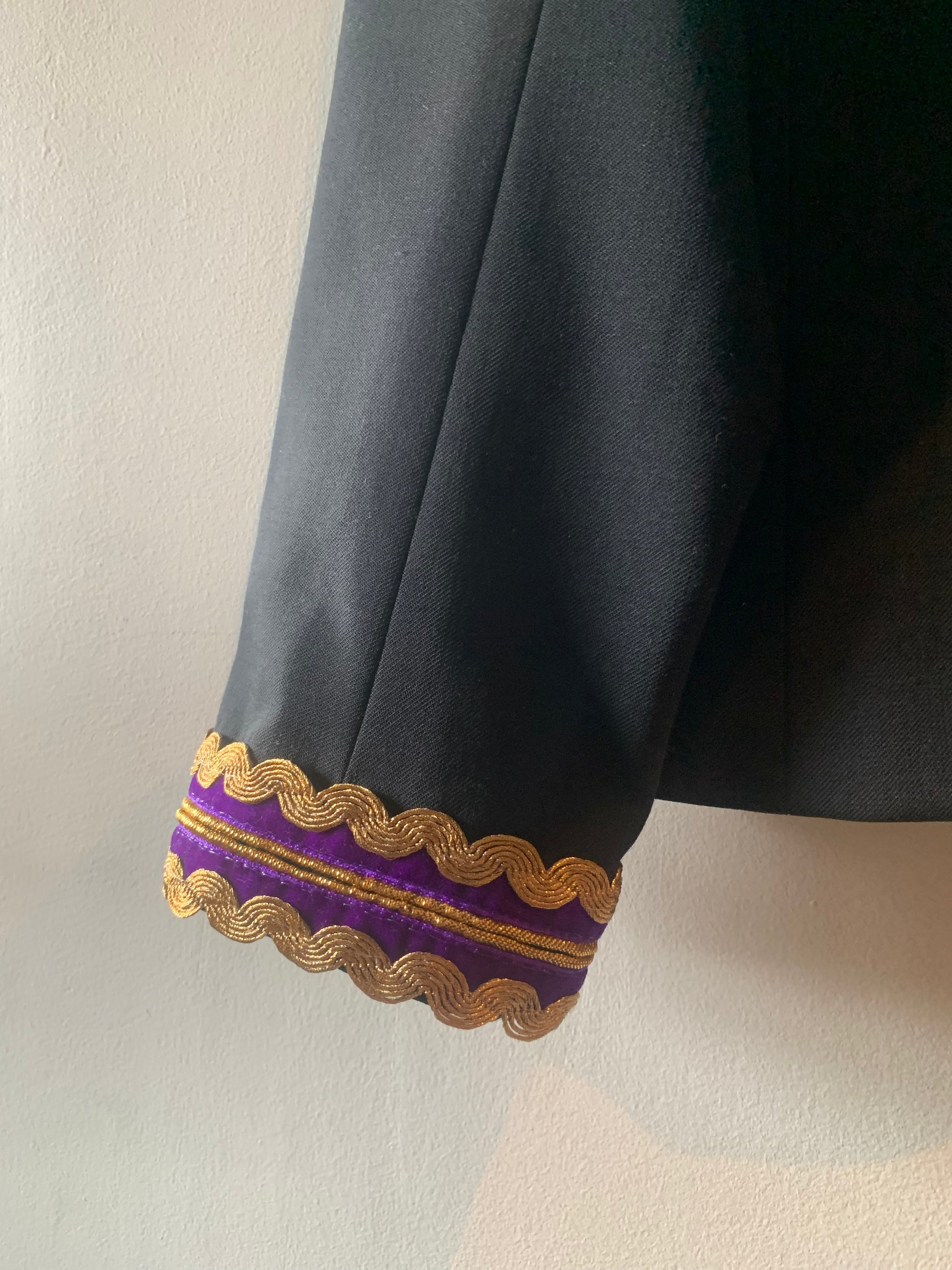 Up-cycled Black Ophelia blazer, with purple and gold velvet trims.