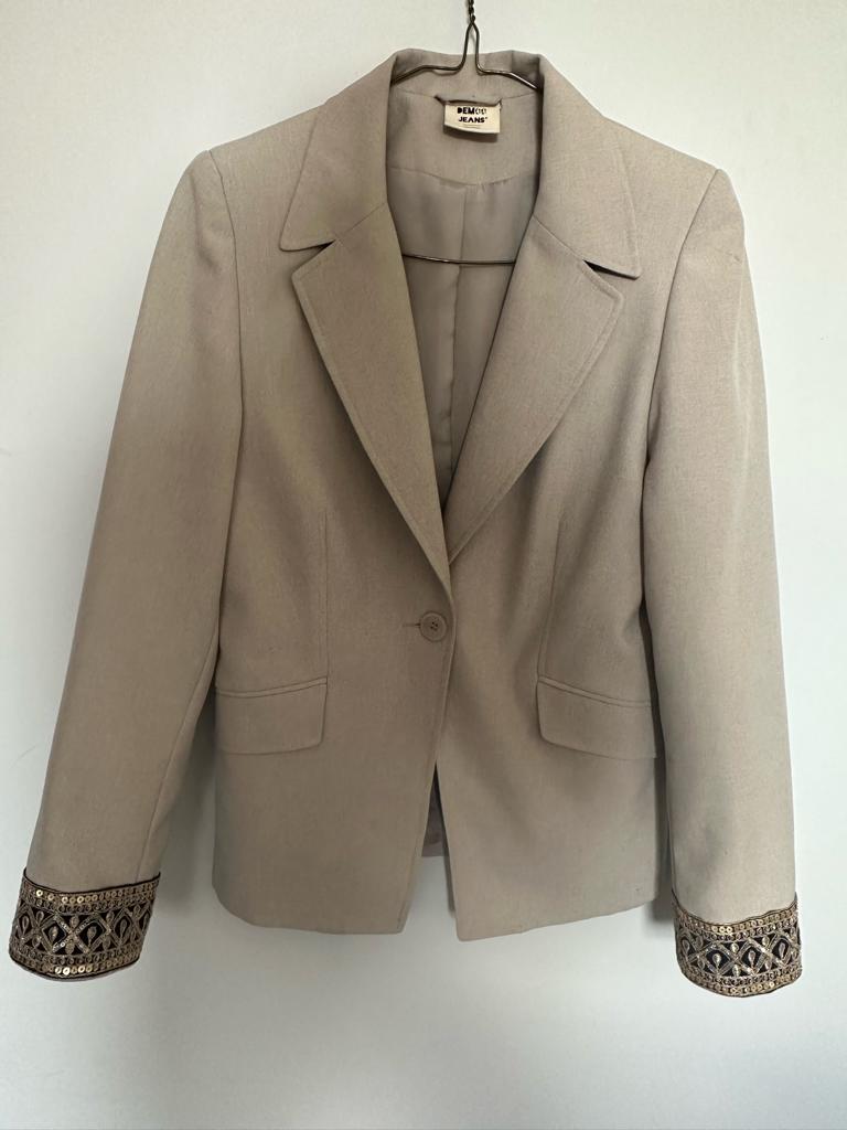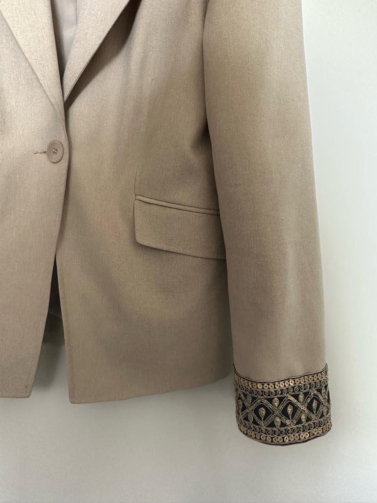 Up-cycled Cream-Beige Ophelia blazer, with navy & gold embellished cuffs.