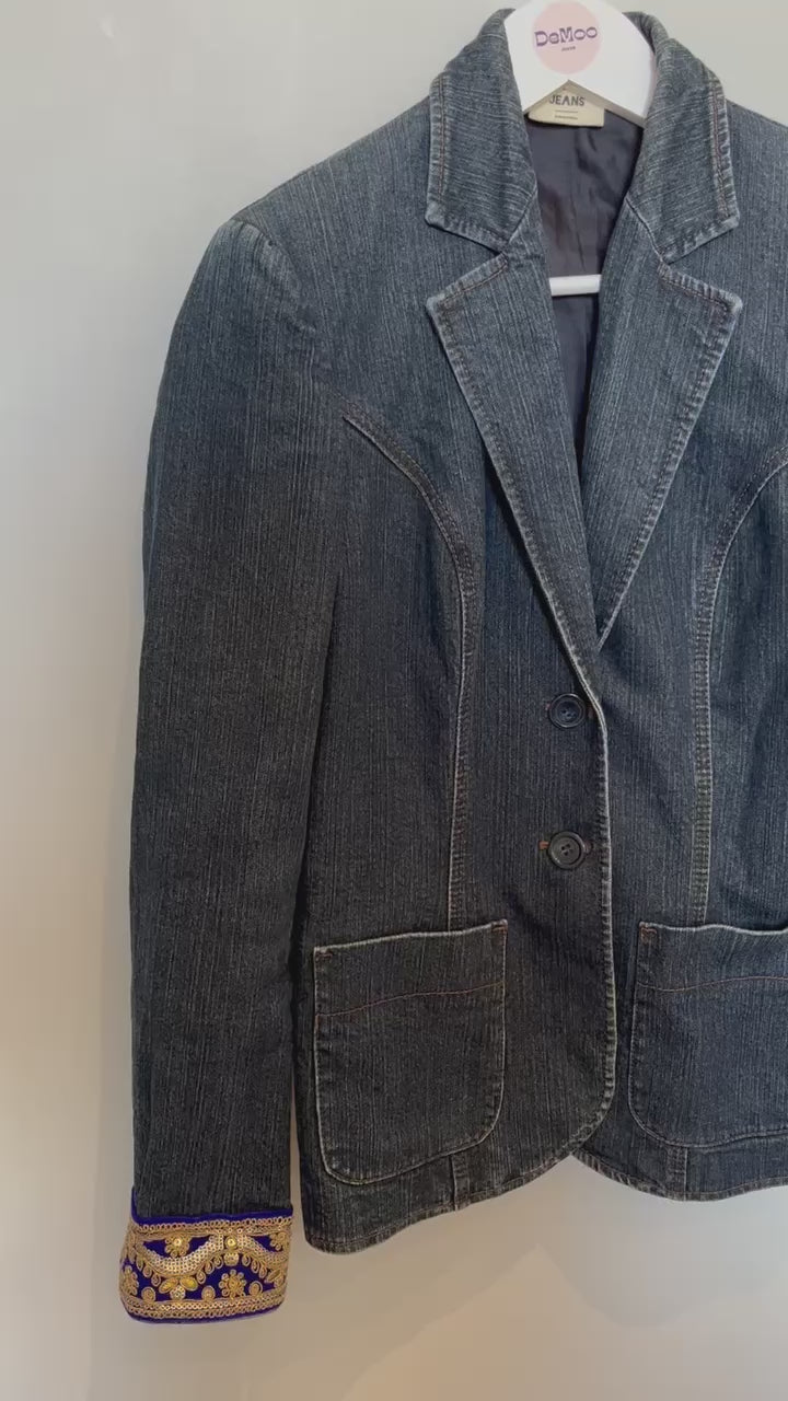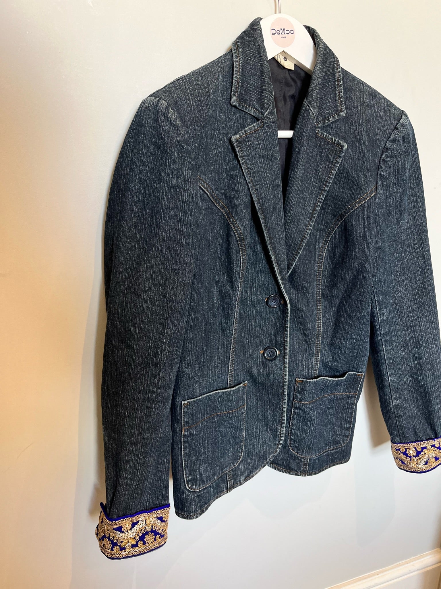 Up-cycled denim Ophelia blazer, with blue and gold embellished cuffs.