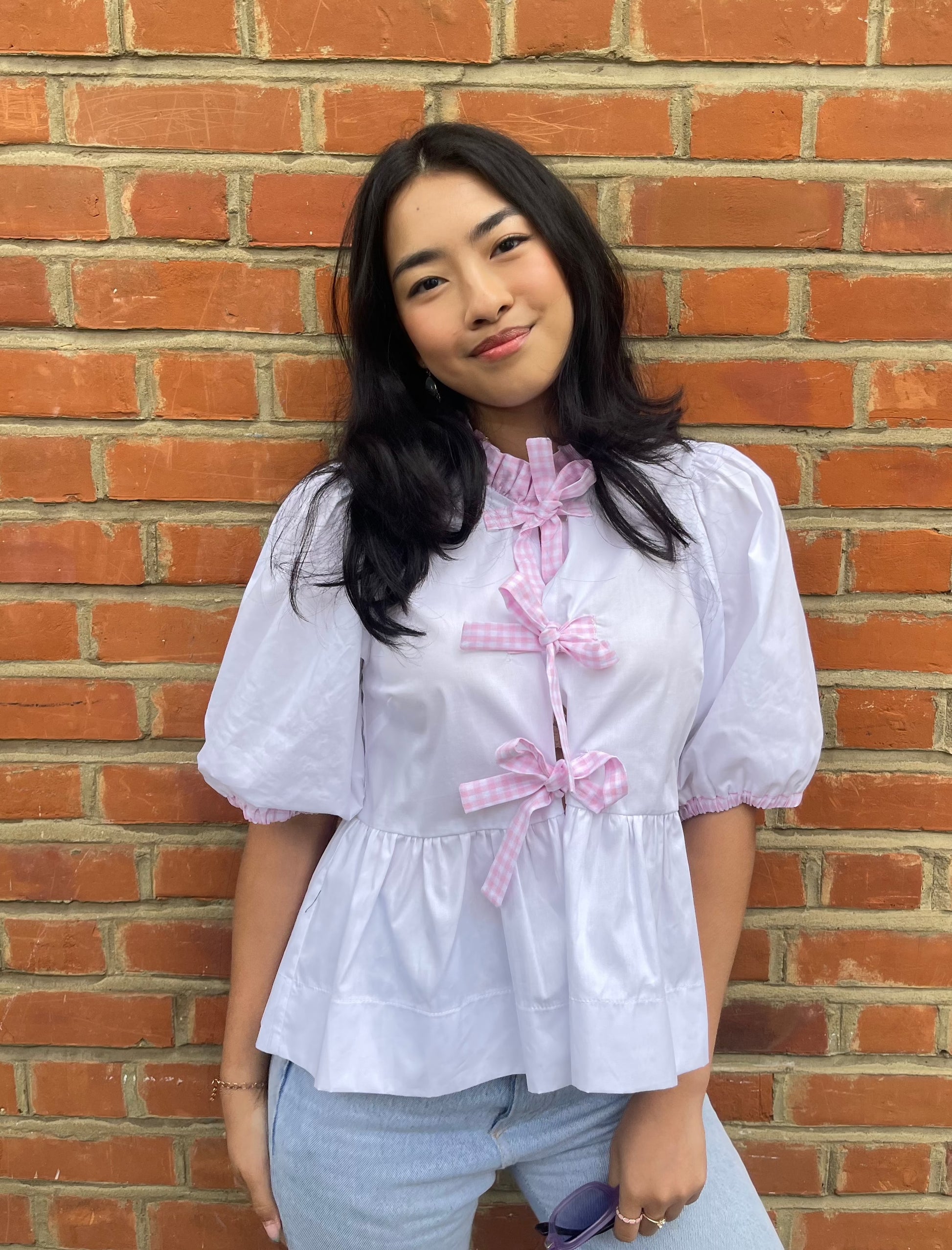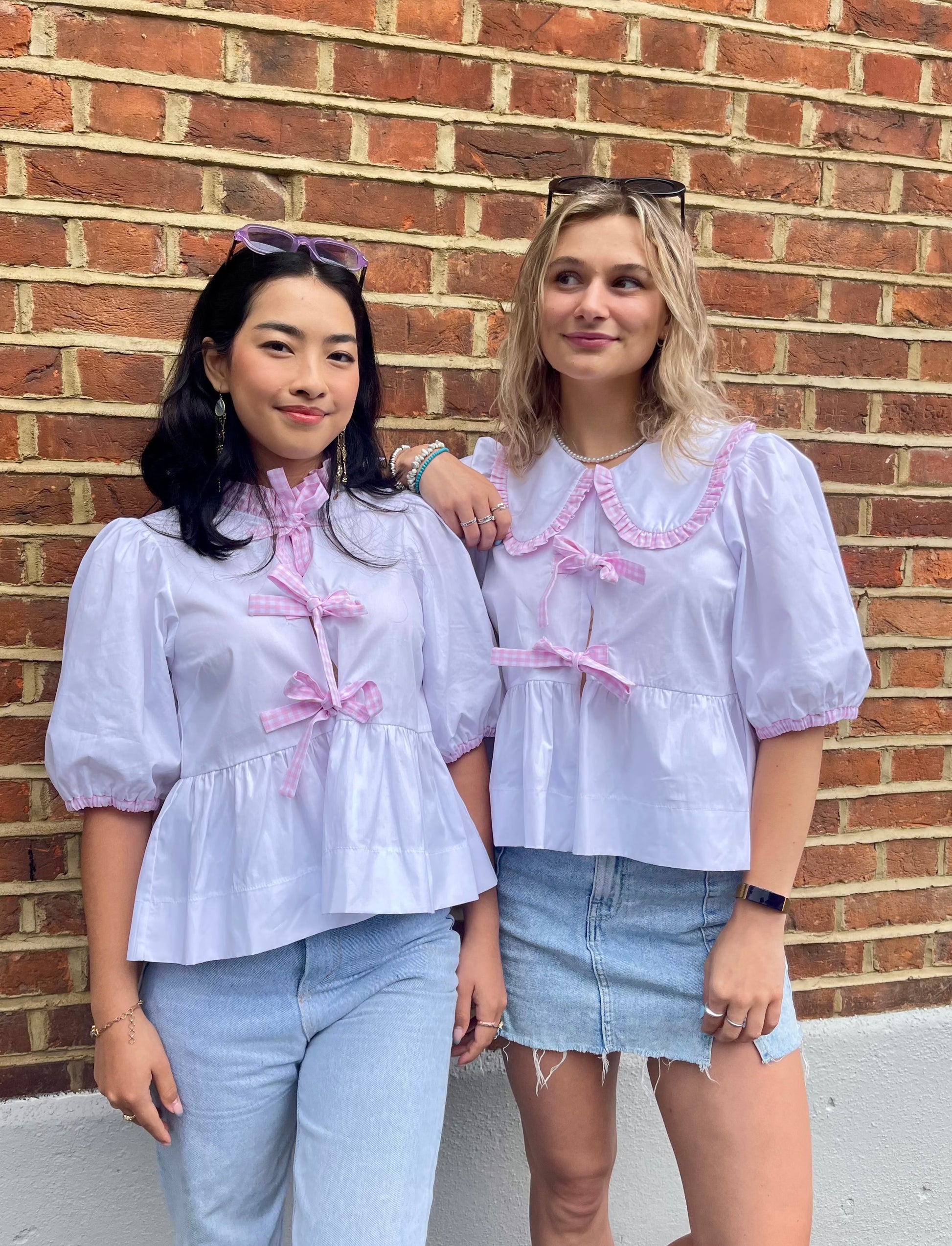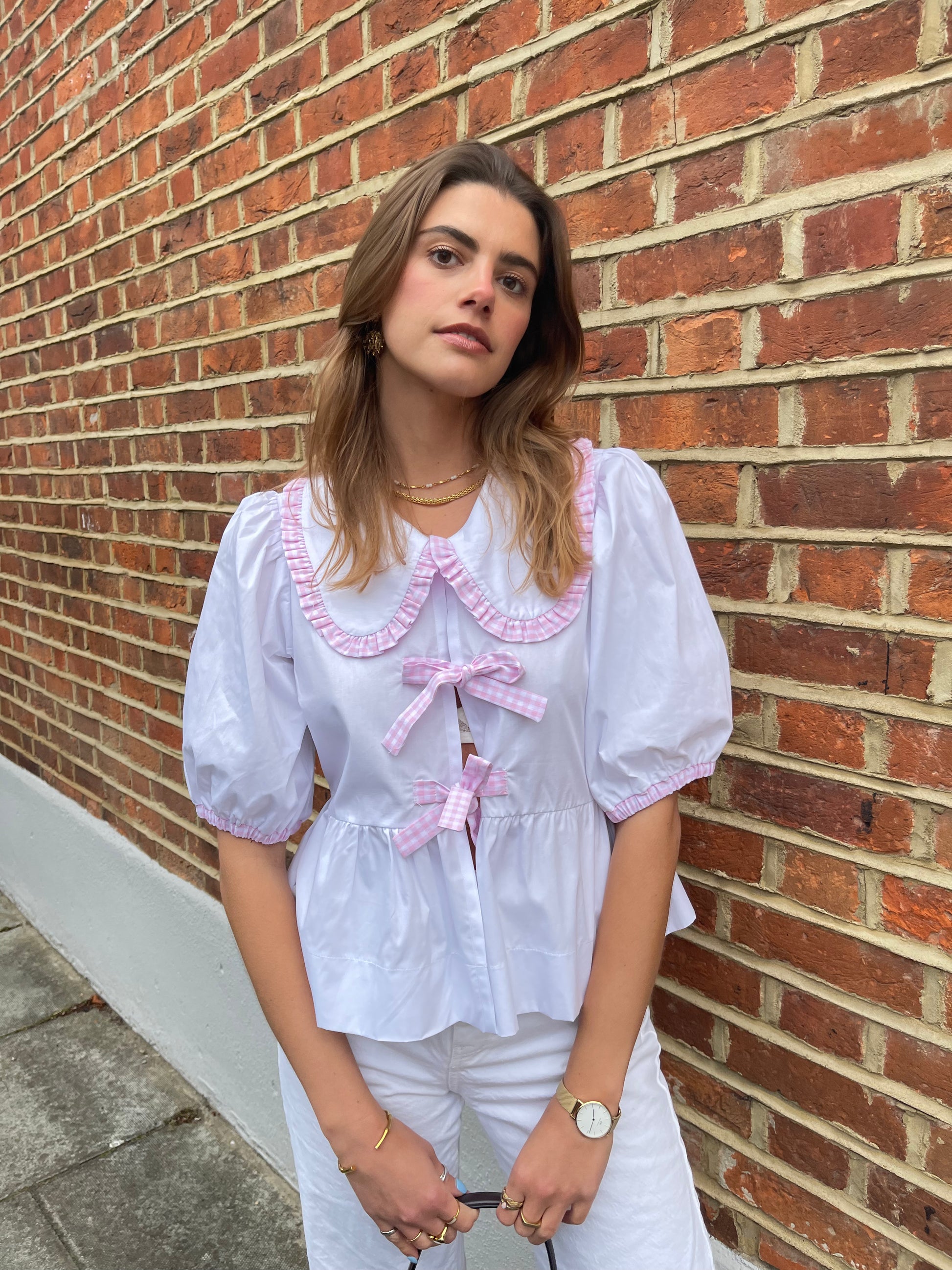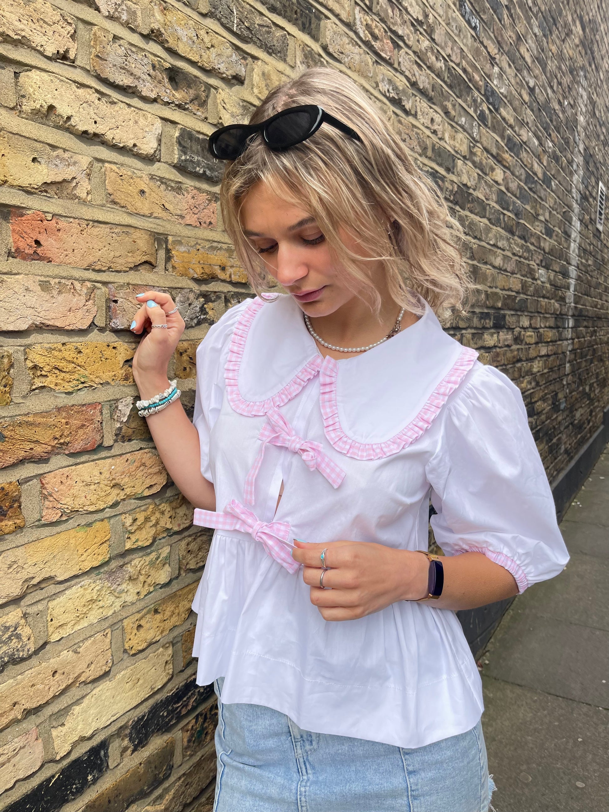 Two collars, two styles - take your pick. She features a white cotton base with baby pink gingham detailing and puffed sleeves. Whether you're opting for the stand-up ruffle collar or the 'Peter Pan' round neck collar, the Penny Puff will turn heads.