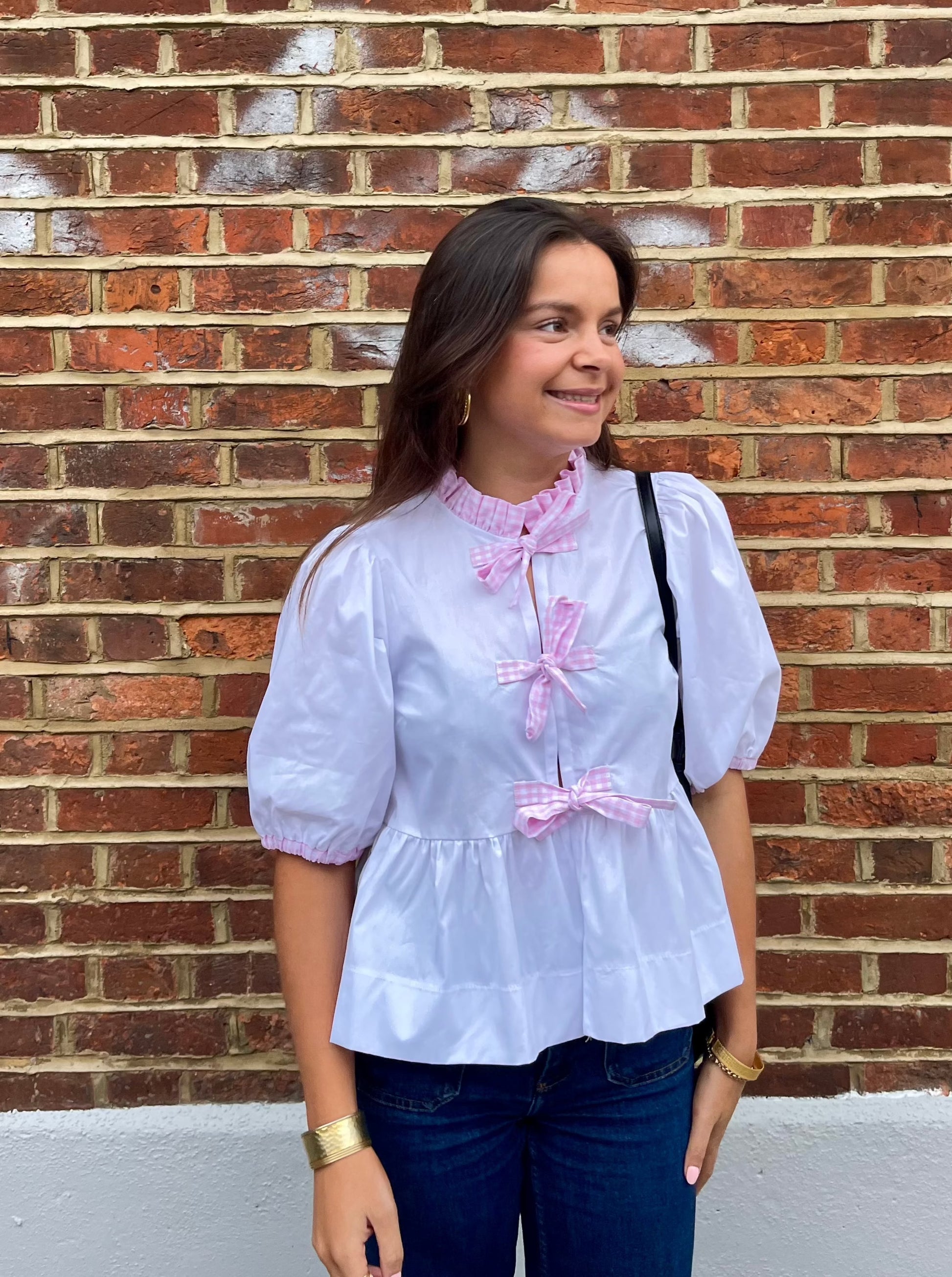 - Featuring: elasticated puff sleeves, peplum waist, ruffle neck, gingham ties