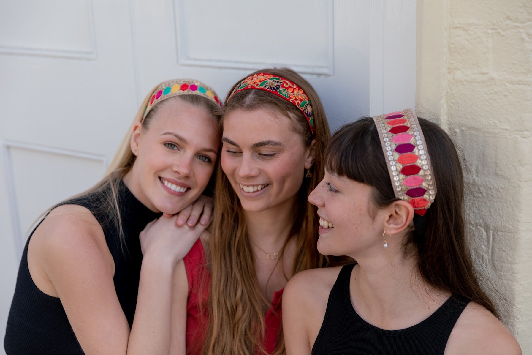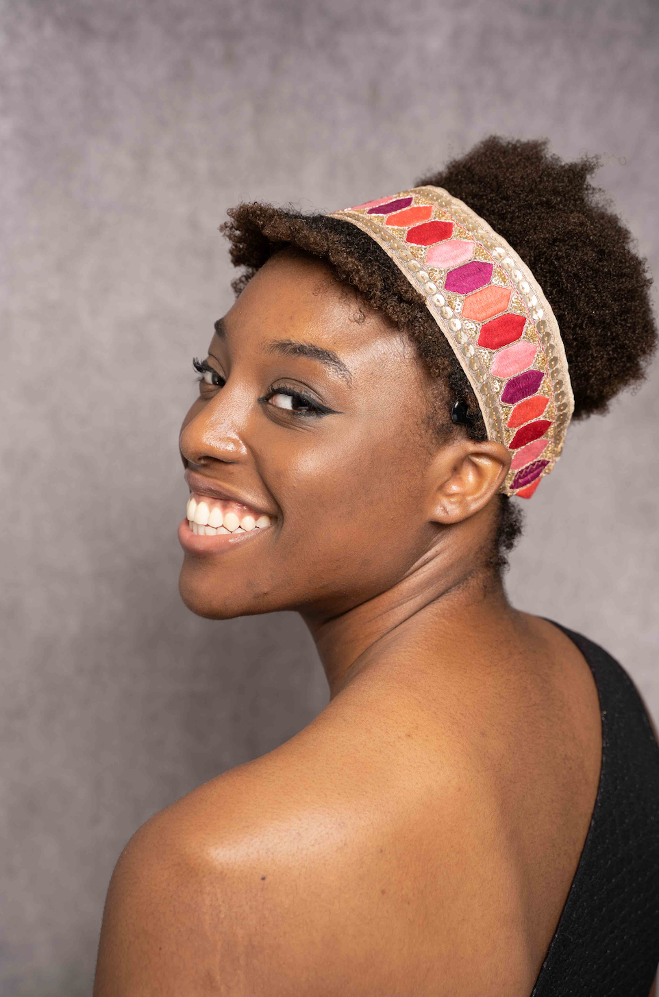 Pink, fuchsia, and plum geometric threads, overlaid onto beige mesh and accompanied by a sequin border.