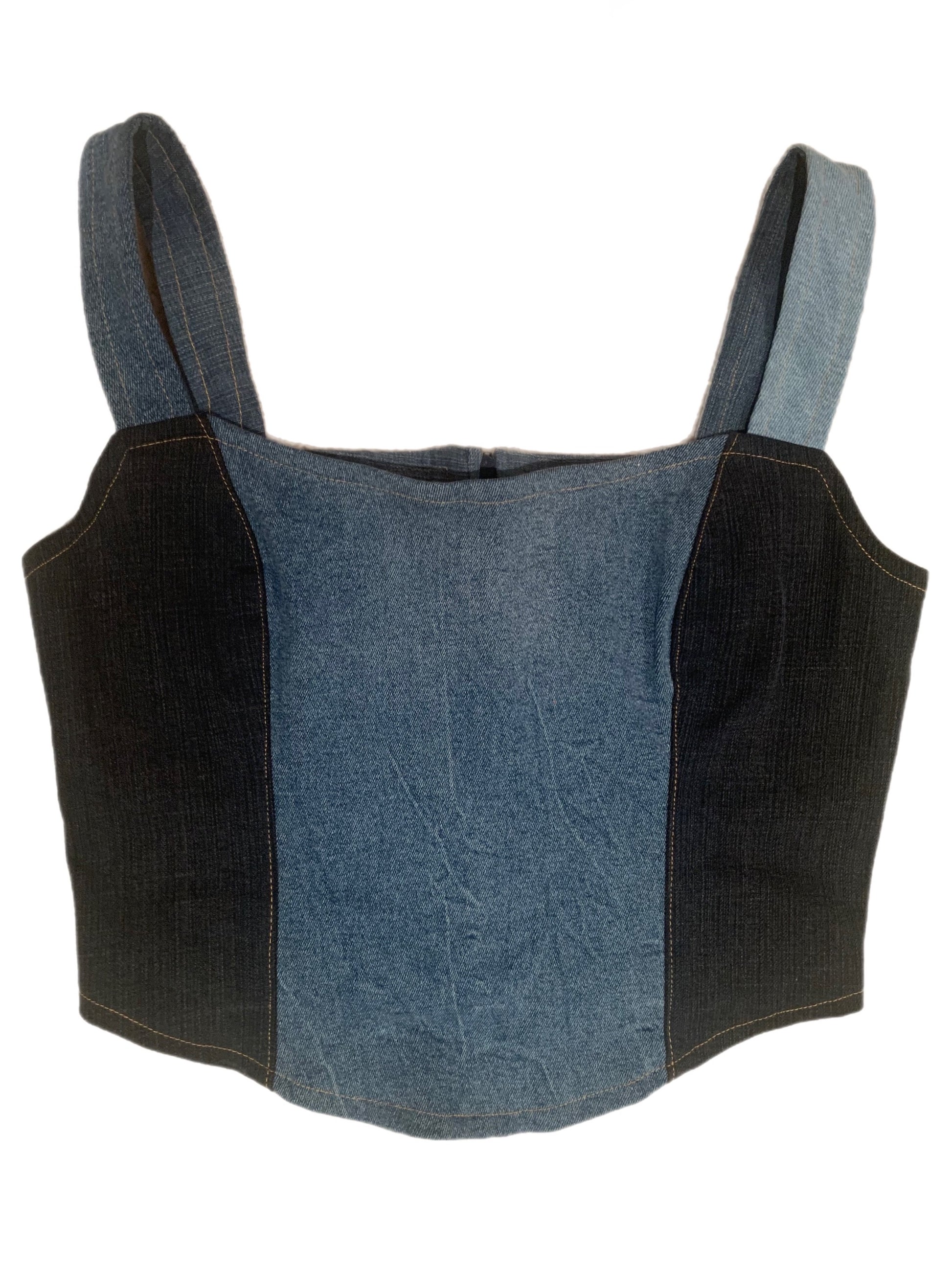 Corset top made from upcycled denim.