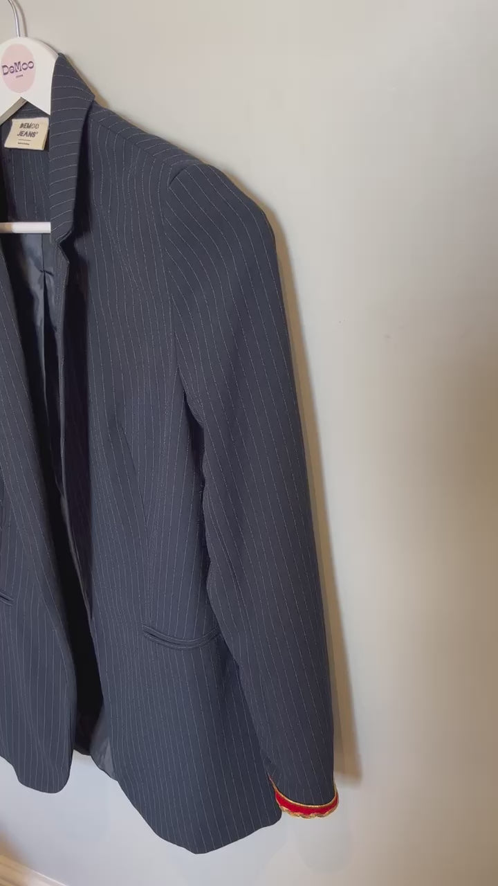 Up-cycled pinstripe Ophelia blazer, with pink and gold velvet trims.