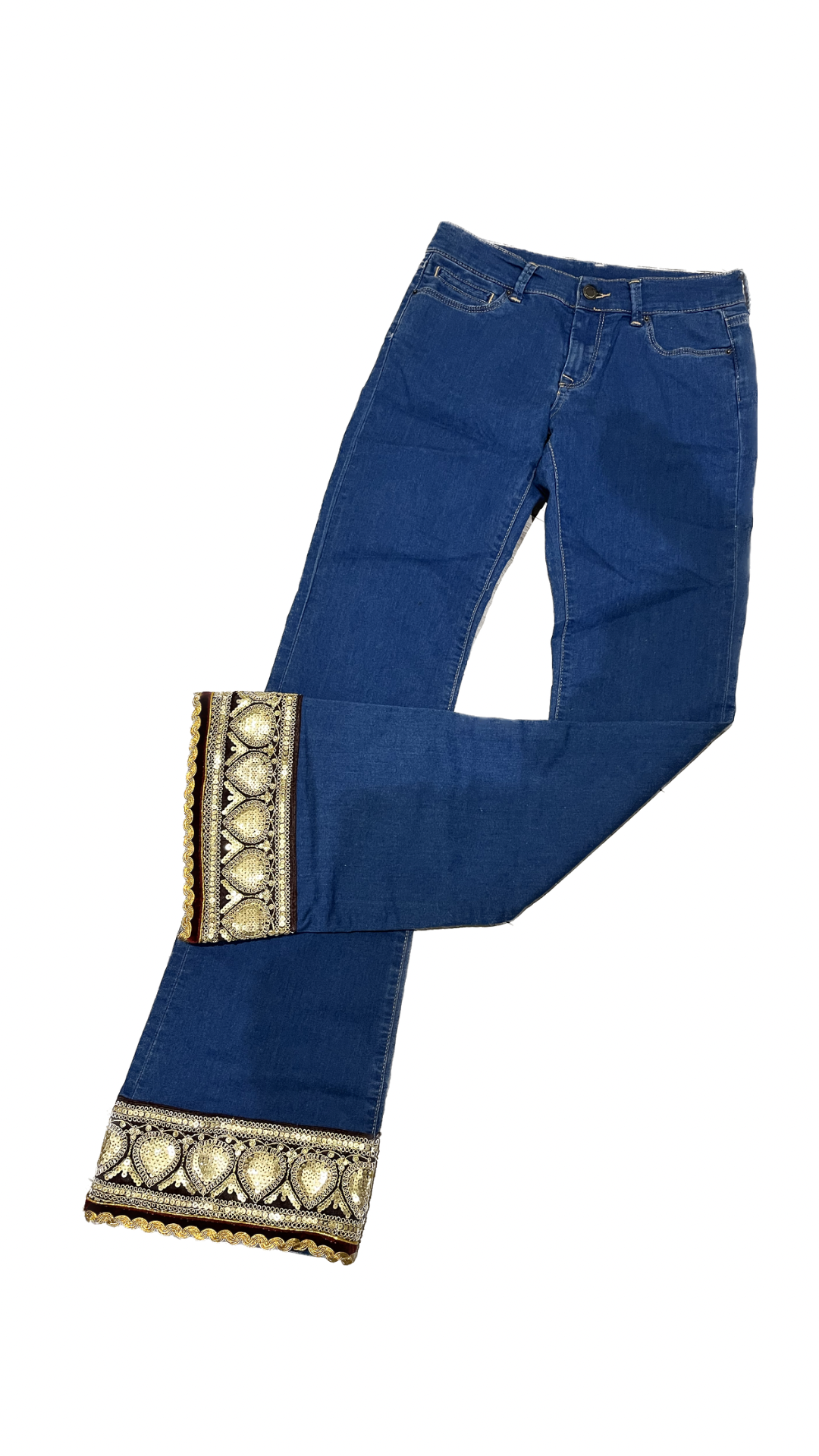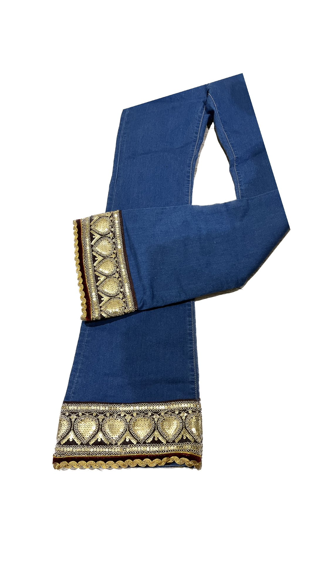 Indigo high-rise flares with our Raspberry red and velvet trims.